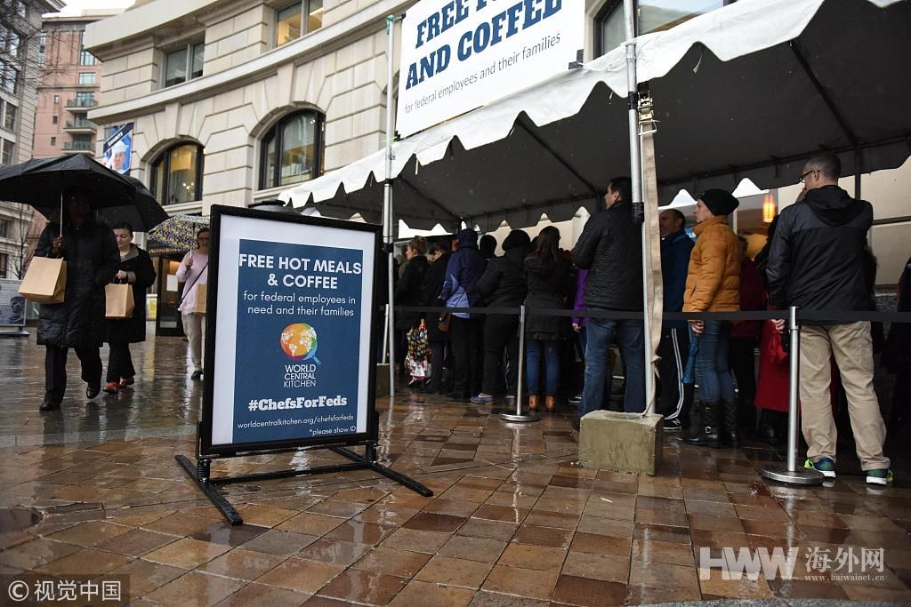 当地时间2019年1月24日,美国联邦政府部分停摆进入第34天。一家公益组织连日来在华盛顿搭设“应急食堂”和“物资中心”,为联邦雇员免费提供餐食和日用品。图为部分联邦雇员在雨中等待领取援助午餐。 陈孟统(美国分社)/中新社/视觉中国