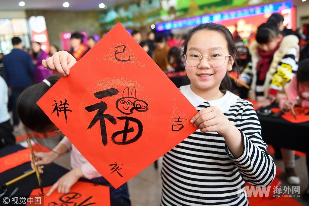 2019年1月25日,山西太原火车站,百名儿童书写春联迎接农历新年,并将春联赠送给候车大厅内的旅客。 武俊杰(山西分社)/中新社/视觉中国