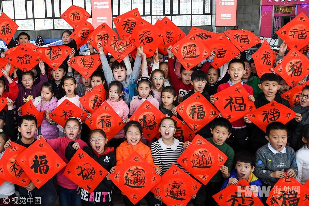 2019年1月25日,山西太原火车站,百名儿童书写春联迎接农历新年,并将春联赠送给候车大厅内的旅客。 武俊杰(山西分社)/中新社/视觉中国