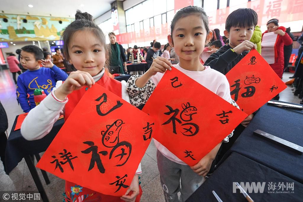 2019年1月25日,山西太原火车站,百名儿童书写春联迎接农历新年,并将春联赠送给候车大厅内的旅客。 武俊杰(山西分社)/中新社/视觉中国