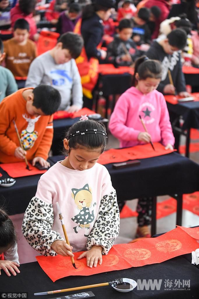 2019年1月25日,山西太原火车站,百名儿童书写春联迎接农历新年,并将春联赠送给候车大厅内的旅客。 武俊杰(山西分社)/中新社/视觉中国