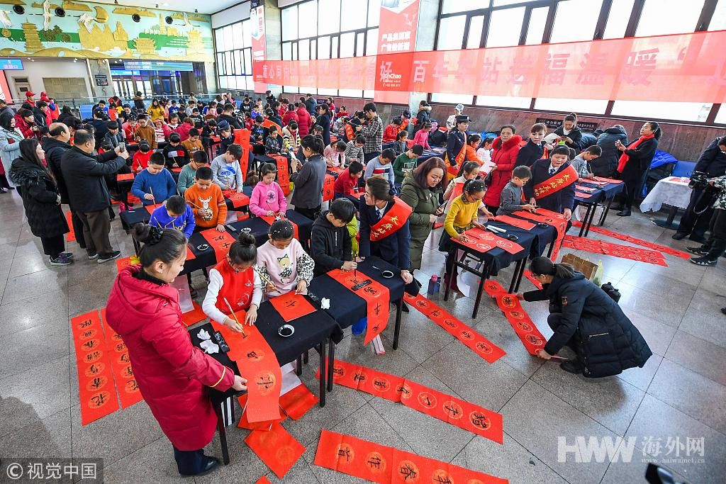 2019年1月25日,山西太原火车站,百名儿童书写春联迎接农历新年,并将春联赠送给候车大厅内的旅客。 武俊杰(山西分社)/中新社/视觉中国
