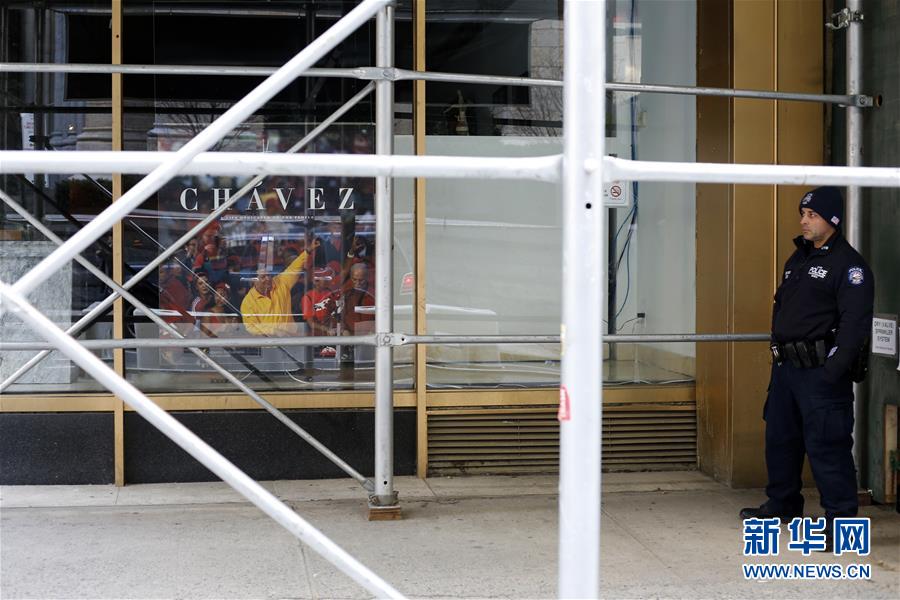 1月25日,在美国纽约,一名警察在委内瑞拉驻纽约总领事馆外警戒。新华社记者 李木子 摄