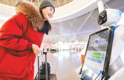 1月22日,在呼和浩特火车东站,机器人为乘客提供咨询服务。 新华社发