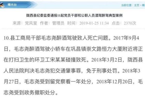 说明中透露,这是法院对1月25日陇西县纪委监委通报 “县工商局干部毛志尧交通肇事致人死亡”事件,并引发相关舆情后的一次主动回应。北青报记者注意到,1月25日,陇西县纪委监委共通报了11起党员干部和公职人员酒驾醉驾典型案例。其中第10起即县工商局干部毛志尧醉酒驾驶致人死亡问题。通报称,2017年9月4日,毛志尧醉酒驾驶小轿车在巩昌镇崇文路恒力大厦附近将正在打扫卫生的环卫工宋某某碰撞致死。2018年3月2日,陇西县人民法院判决毛志尧犯交通肇事罪,免于刑事处罚。2018年3月27日,毛志尧受到留党察看一年处分,2018年12月20日,毛志尧受到政务撤职处分。