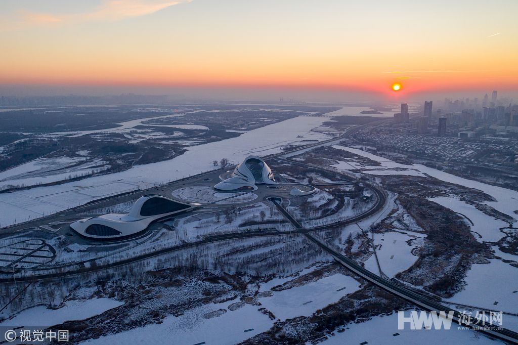 2019年1月26日,哈尔滨,日落时分,哈尔滨大剧院独特的冰雪造型与日落时分的阳光相融合。