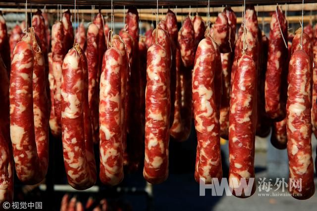 江苏淮安,猪年春节临近,街头挂满了传统手工艺腌制品美食,有香肠、咸肉、猪头肉,年味渐浓。(来源:视觉中国)