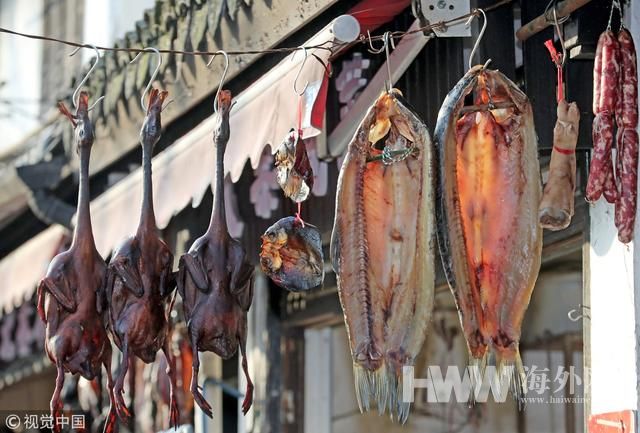 春节将至,各地都晒肉迎新春,猪肉、板鸭、鱼肉一片片洗净、晾晒,勾引着我们的食欲。2019年1月17日,杭州终于迎来阳光满溢的大晴天,太庙广场边的居民们忙着把酱鸭、酱肉、酱鱼拿到太阳底下晾晒,油光锃亮的酱货散发着诱人的香气。(图片来源:视觉中国)(来源:视觉中国)