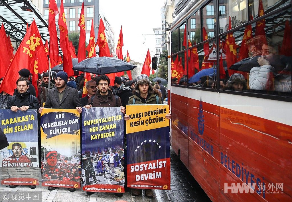 ​当地时间2019年1月26日,土耳其伊斯坦布尔,土耳其共产党成员举横幅示威游行,支持委内瑞拉总统马杜罗。