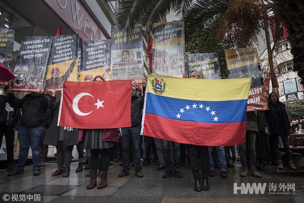 ​当地时间2019年1月26日,土耳其伊斯坦布尔,土耳其共产党成员举横幅示威游行,支持委内瑞拉总统马杜罗。