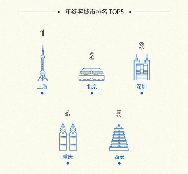 从地域角度来看,报告显示,全国年终奖城市排名中,前三由上海、北京、深圳三座一线城市占据,非一线城市的重庆和西安,排在第四和第五名,而广州则未排进前五。