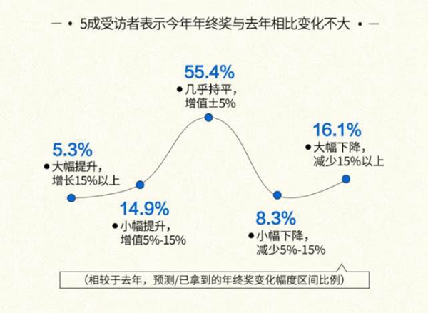 这样的数字基本与去年持平。报告显示,55.4%的受访者2018年年终奖与2017年相比变化不大,20.2%的受访者2018年年终奖比2017年增加,24.4%的受访者2018年年终奖比2017年减少。