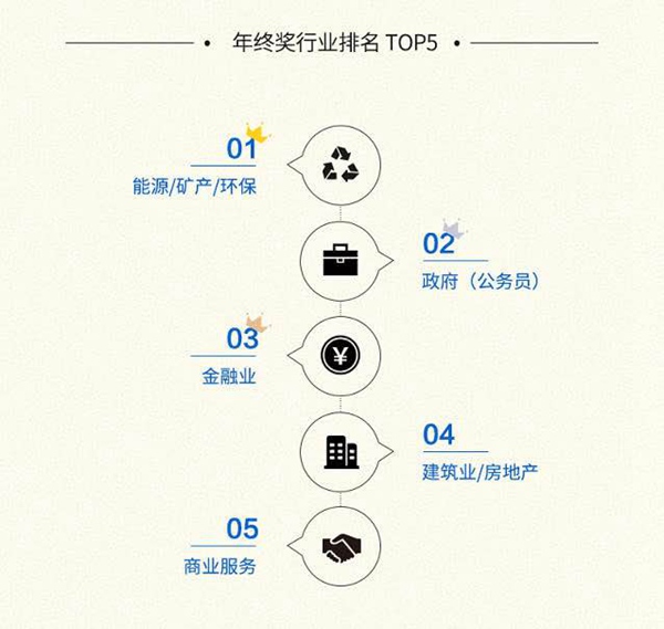 从行业来看,报告显示,全国年终奖行业排名前五分别是:能源/矿产/环保、政府(公务员)、金融业、建筑业/房地产和商业服务。传统比较“壕”的互联网、通信企业则没有上榜。