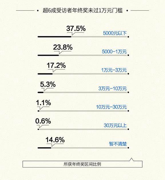 在调查中,超6成受访者年终奖未过1万元门槛,4成受访者年终奖不及预期。报告显示,61.3%的受访者年终奖未过1万元门槛,22.5%的受访者年终奖在1万元至10万元之间。不过,也有公司依旧“壕”,有1.7%的受访者年终奖在10万元以上,还有0.6%的在30万元以上。