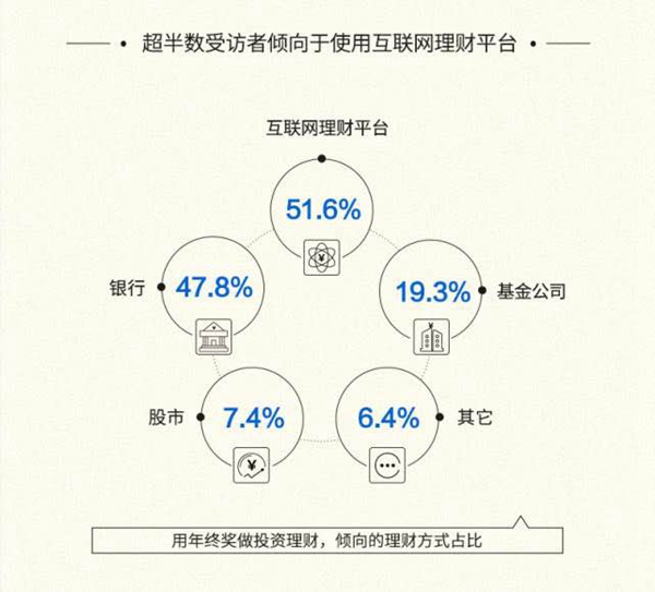 拿到钱如何投资?超5成受访者年终奖理财倾向互联网理财平台,倾向投资股市的受访者不足1成。报告显示,51.6%的受访者倾向于在互联网理财平台(如腾讯理财通等)进行年终奖投资理财,47.8%的受访者倾向于在银行进行年终奖投资理财。股市低迷影响了用户理财行为,只有7.4%的受访者倾向于在股市进行年终奖投资理财。