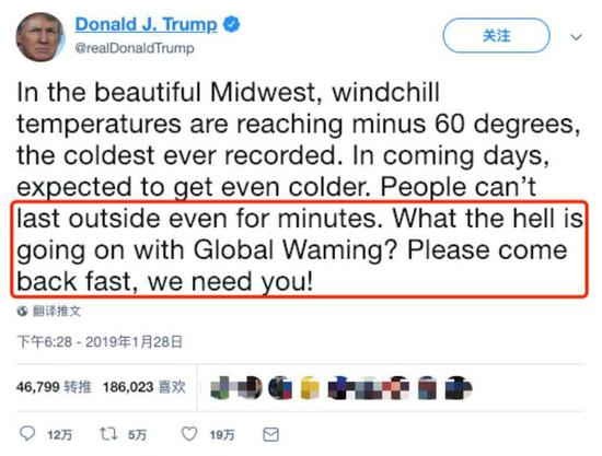 而美国总统特朗普竟然也在推特发问:天气这么冷,说好的全球变暖呢?