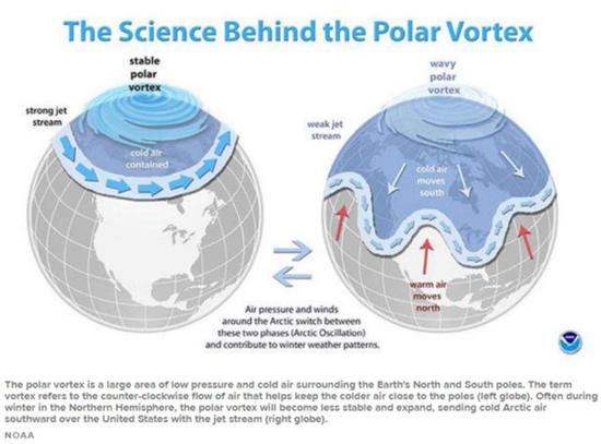 CBS报道中称,从科学的角度来看,由于气候变化,地球总体正在变暖,但北极附近地区变暖的速度是全球其他地区的两倍多,这种“北极放大效应”在冬季也尤其明显。当暖空气侵入北极圈时,削弱了极地的漩涡,将冷空气团向南转移到了欧洲、亚洲和美国。