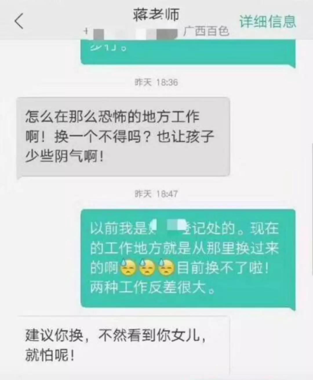 根据家长在网上发帖举报称,广西百色市实验小学三年级二班班主任兼语文老师蒋玉芬老师,在得知班里一学生的家长在殡仪馆工作后,先提出希望家长可以换工作,后又称以前一个同事在殡仪馆举行仪式,那一幕让她怕到今天。