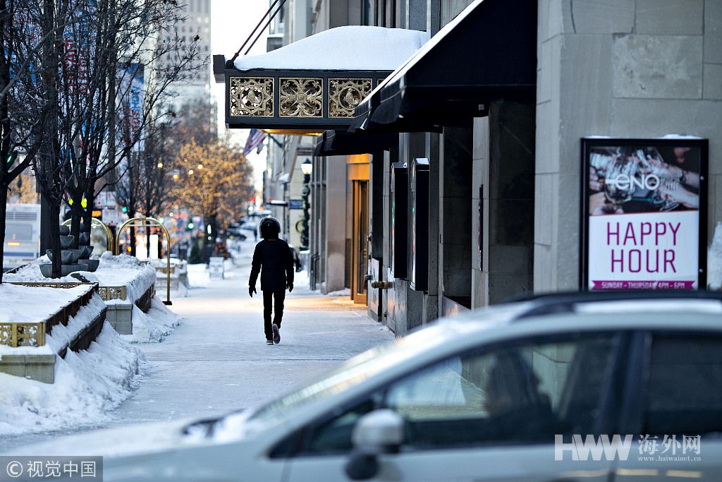 当地时间2019年1月30日,美国伊利诺斯州芝加哥,当地遭寒流入侵。图为户外,行人减少。