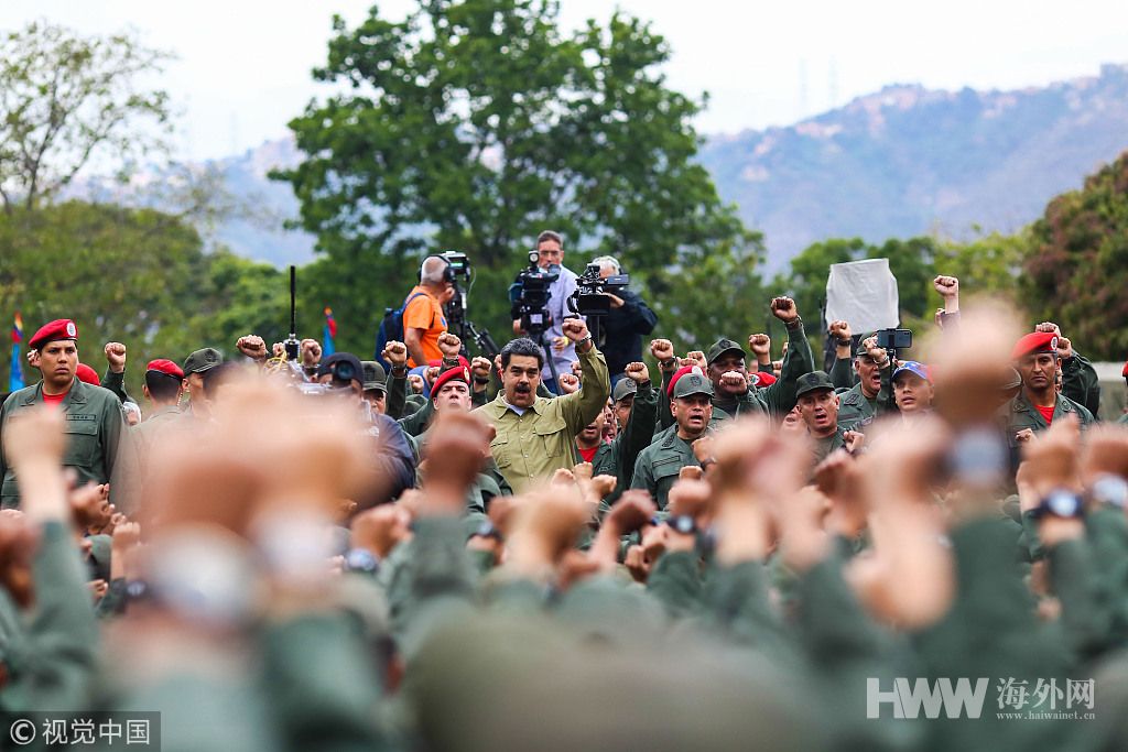 当地时间2019年1月30日,委内瑞拉加拉加斯,委内瑞拉总统马杜罗在军事基地会见玻利瓦尔国家武装部队士兵。