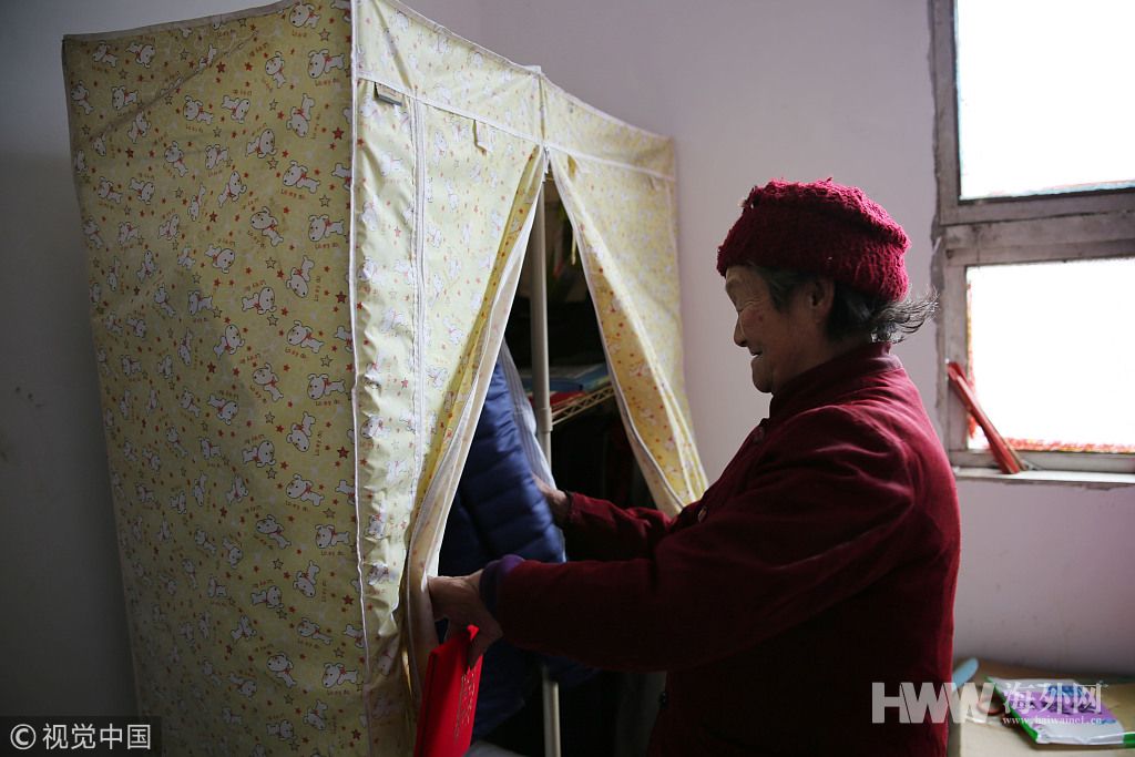谭少英老人把儿子的衣服挂在一个简易衣柜里。一件件都洗得干干净净,挂得整整齐齐。