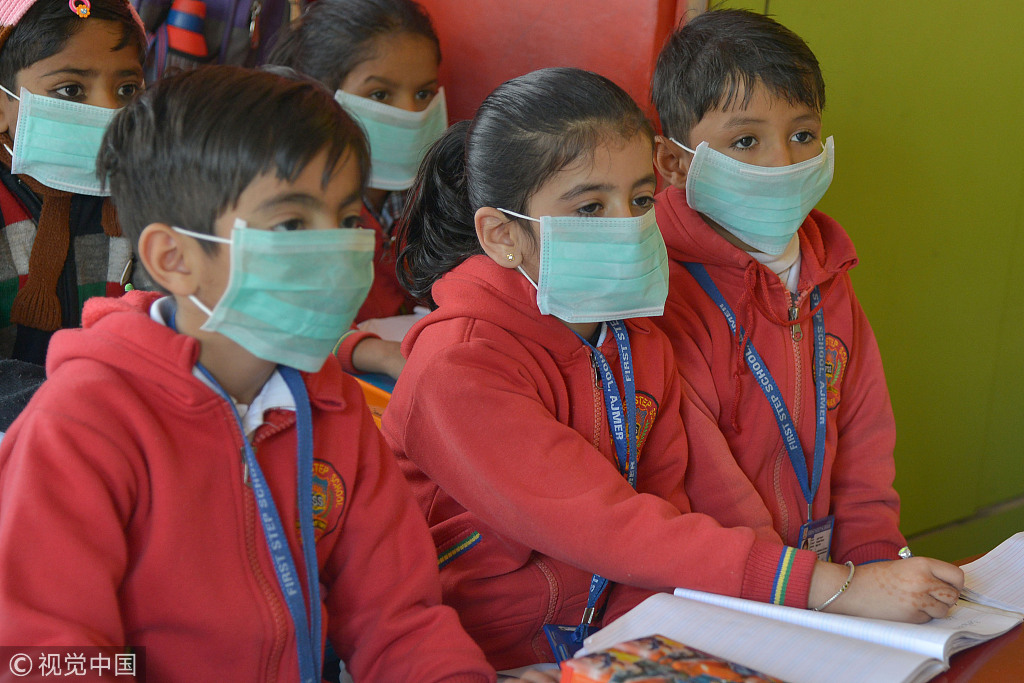当地时间2019年1月31日,印度拉贾斯坦邦,学生在采取预防猪流感的措施。在过去的一个月里,数百个猪流感病例曝光,猪流感再次成为印度的头条新闻。