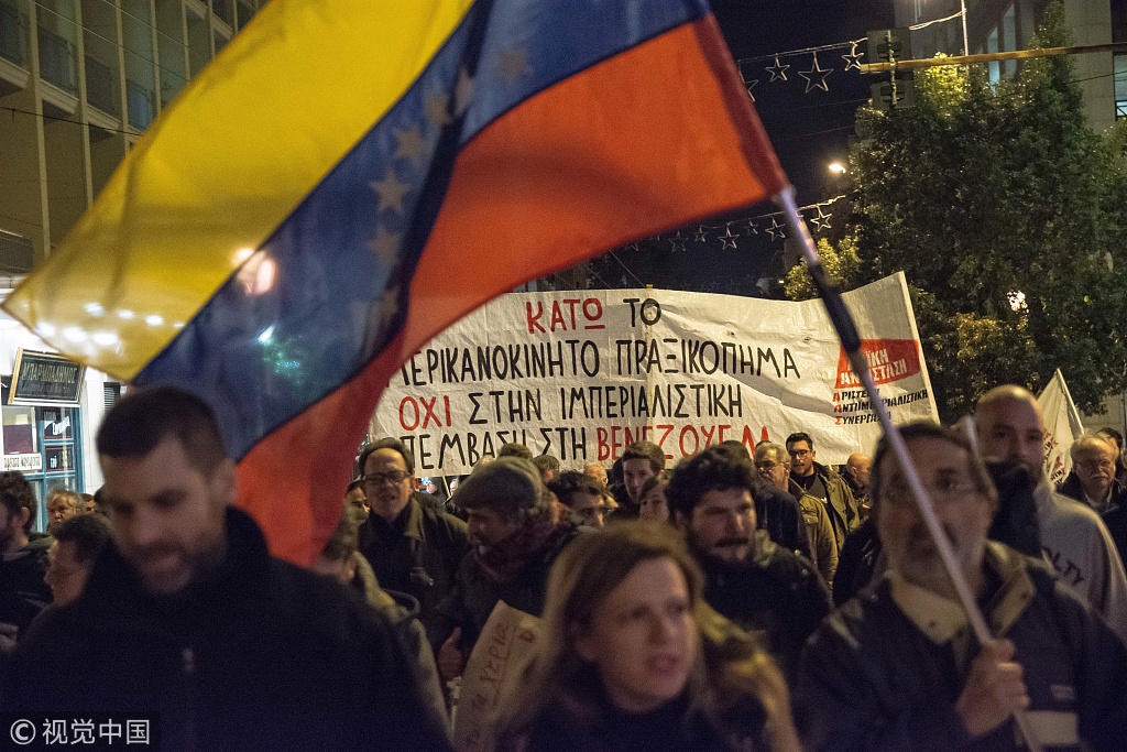 希腊雅典民众游行抗议美国干预委内瑞拉内政