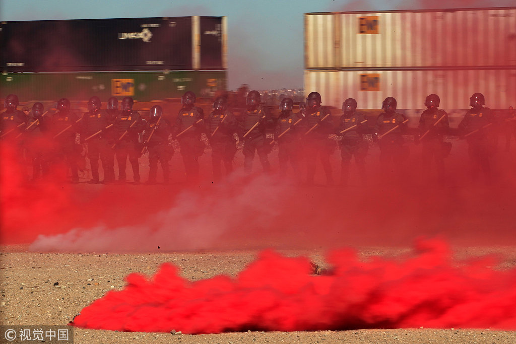 当地时间2019年1月31日,美墨边境,美国边境巡逻队埃尔帕索部门的特工在新墨西哥州Sunland公园的Anapra地区进行了一次机动野战部队训练,从墨西哥Ciudad Juarez边境的墨西哥一侧可以看到。