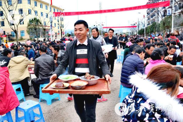 下午17时,1200余桌团圆饭陆续上菜,蒸蹄髈、辣子鸡、扣肉、煎鱼,每桌15个菜,很是丰盛。移民群众或一家人团坐,或亲戚朋友同桌,大快朵颐,享受这餐别样的团圆饭。