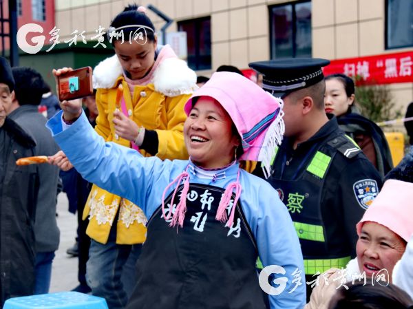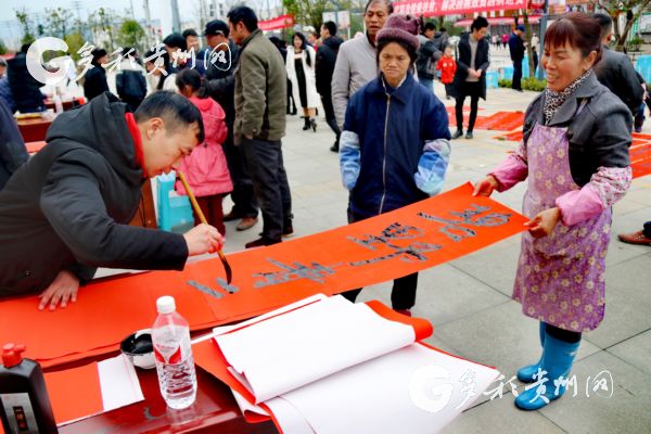 在惠水县明田易地扶贫搬迁安置点新民社区,写春联、拍全家福、贫困户慰问、医疗义诊、春风招聘会、义务理发等一系列送温暖活动为易地扶贫搬迁群众送来了和谐的幸福年味。