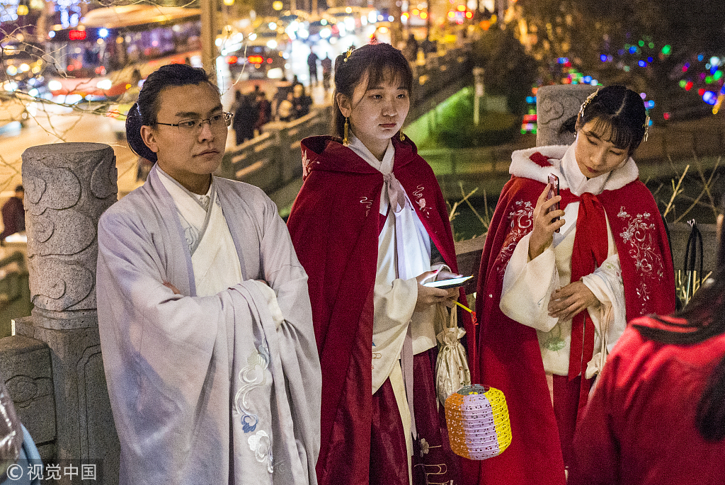 2019年2月1日,成都春节期间即将恢复的“夜游锦江”夜游航段将从339成华公园码头到合江亭段分段行船,全程约4.4公里。在合江亭,数百汉服爱好者齐聚。