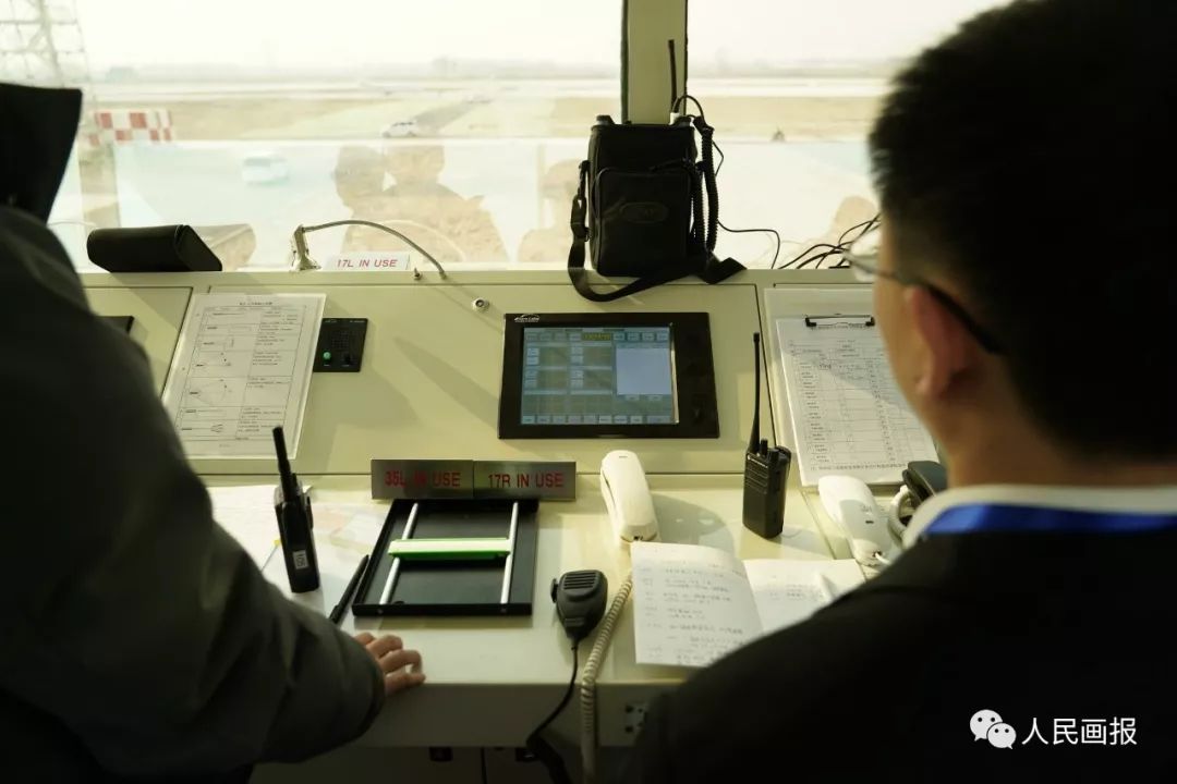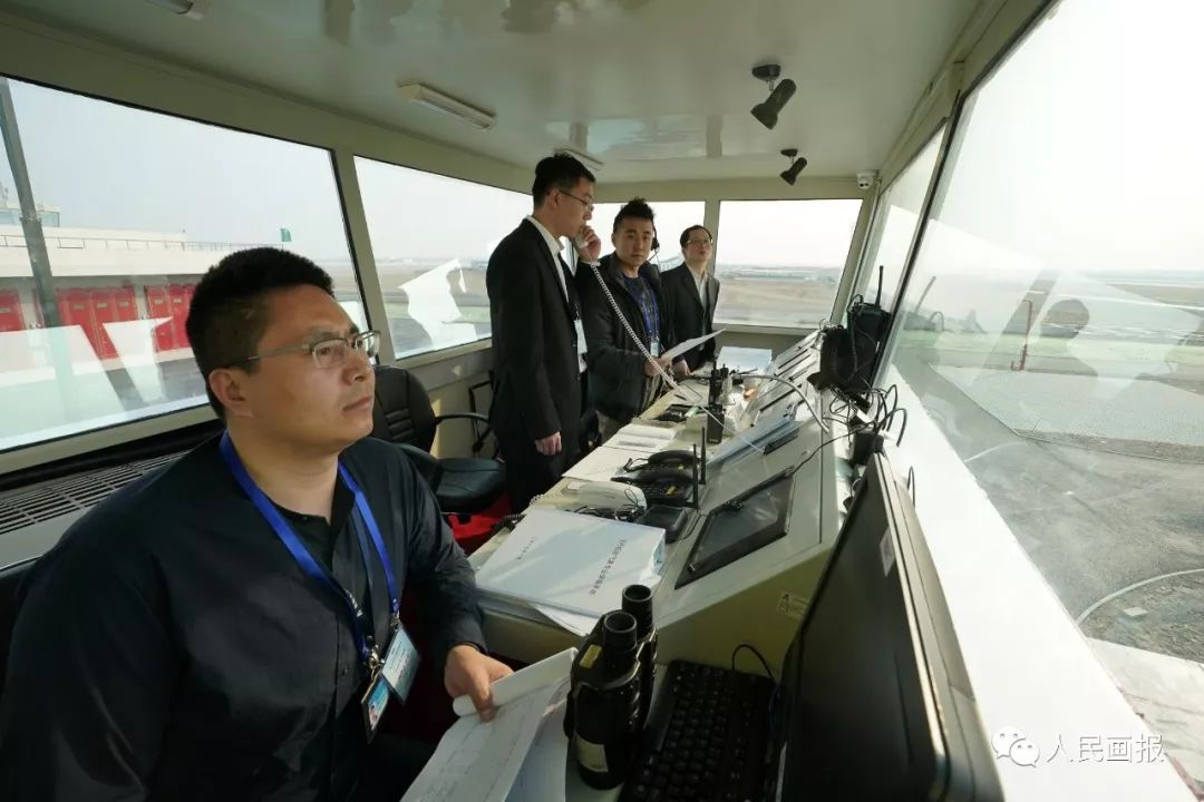 在塔台管制室执行校飞任务的校飞气象保障工程师贾军强(左一)与专职管制员们。专职管制员从气象保障工程师那里获得气象信息,通过无线电指挥校飞飞机在大兴国际机场的落地、起飞、通场以及跑道拉升等工作。通过和机场人员的协调,得知跑道的使用状况。如果把航空公司的飞机比喻成公交车,机场比喻成车站,那么管制员们就相当于交警,其角色十分重要。