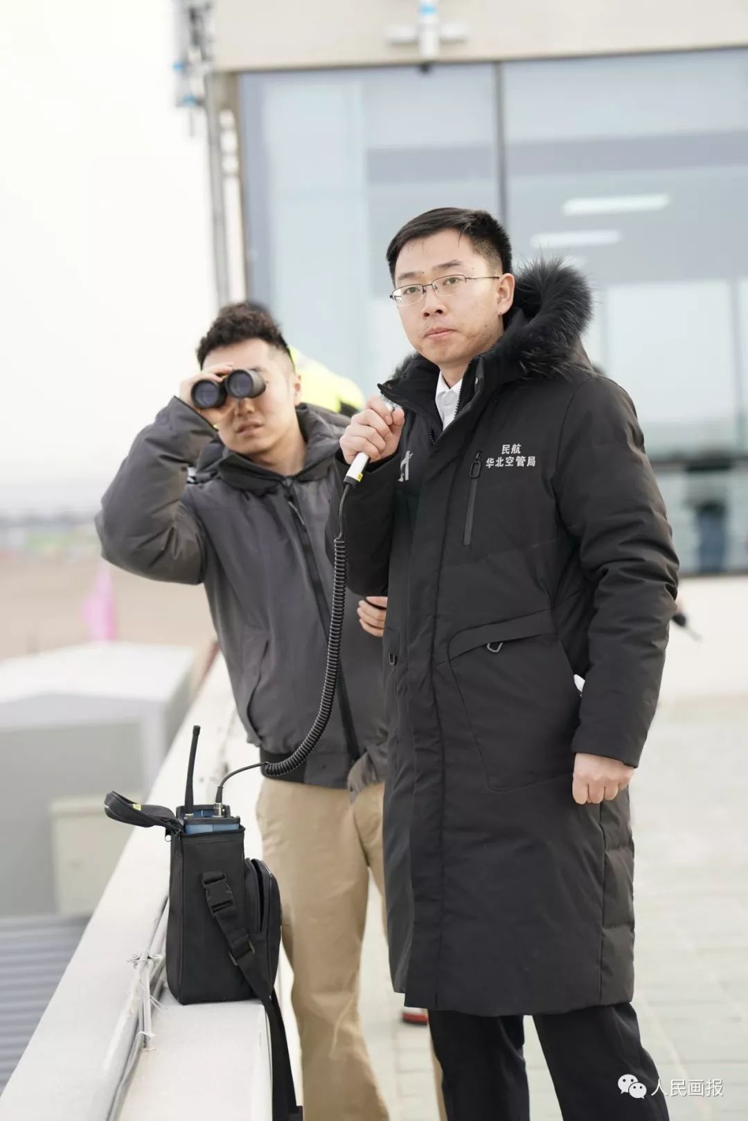 一架校飞飞机即将降落,两位专职管制员正在瞭望塔上通过望远镜查看周围的情况,并通过无线电与管制室进行情况沟通。