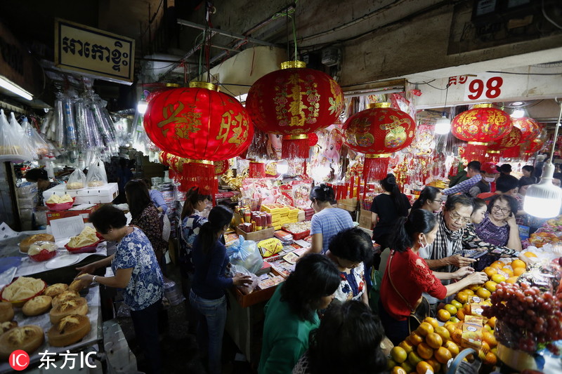 当地时间2019年2月3日,柬埔寨金边,春节临近,当地商店挂满年货商品。