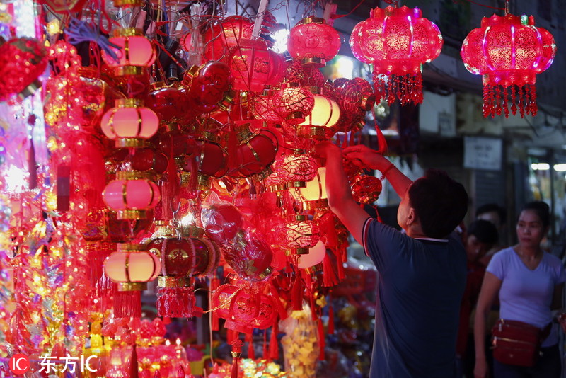 当地时间2019年2月3日,柬埔寨金边,春节临近,当地商店挂满年货商品。