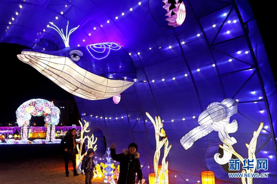 2月2日,游人在张家口新春灯会上赏灯。 当日,2019张家口新春灯会在河北张家口市经济开发区老鸦庄镇亮灯,百余个大型灯组璀璨夺目。 新华社发(武殿森 摄)