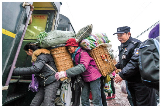 眼看春节就要到了,沿途各站旅客越来越多,他们中有的是扛着大包小包回家的打工者,有的是背着山货去城里卖、再买回年货的村民。陈超反复叮嘱车厢里的每位旅客注意安全,看管好随身财物。