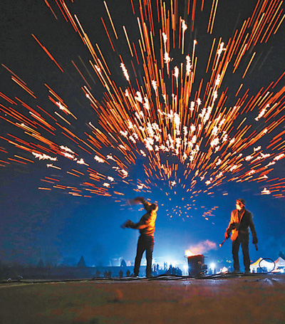 2月1日,河南武陟县嘉应观景区举行“打铁花”迎新春活动,民间艺人将生铁块烧到一定熔度后,用木板将铁块打上天空,形成“铁花火雨”景象,营造出浓浓的节日氛围。 冯小敏摄(影像中国)