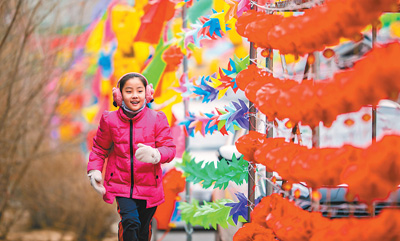 春节将至,内蒙古呼和浩特市玉泉区的广场、公园处处洋溢着红红火火的年味。图为2日,小朋友在玉泉区通顺大巷的彩灯墙旁游玩。 丁根厚摄(人民视觉)