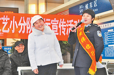 为了给回乡旅客营造更温馨舒适的出行环境,大同铁路公安处文艺轻骑兵小分队近日带着精心编排的文艺节目走入车站候车室,为旅客带去欢笑和温暖。 任 军摄