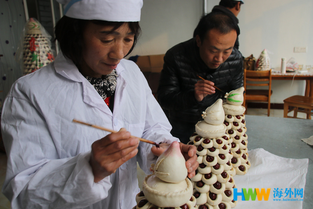 图为刘秀华和儿子正在对步步糕上色。(海外网 王栋 摄)