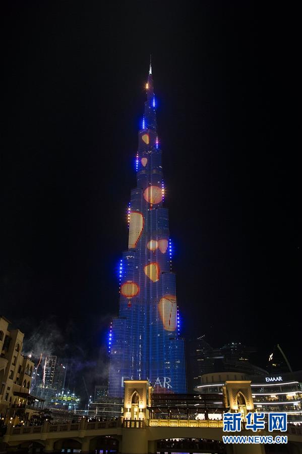 2月4日,在阿联酋迪拜,世界第一高楼哈利法塔上演春节灯光秀,迎接中国新年。新华社发(马哈茂德·哈立德 摄)