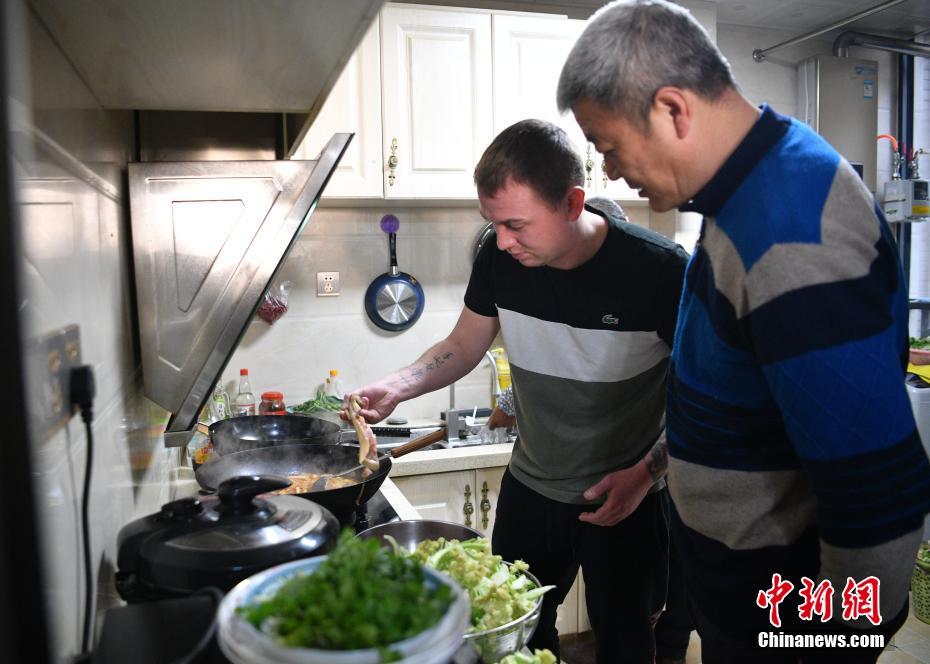 图为“洋女婿”Liam McCarthy在厨房里学习烹制水煮鱼。刘忠俊 摄