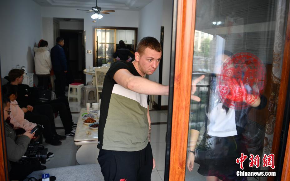 2月4日,除夕,家住四川乐山的英国“洋女婿”Liam McCarthy与妻子黄蔚茹女士提着精心准备的过年礼包,抱着11个月的儿子Caleb,乐呵呵地踏上了回犍为老家过年的旅途,这是Liam McCarthy第一次过中国年。图为“洋女婿”Liam McCarthy与妻子一起贴窗花。刘忠俊 摄