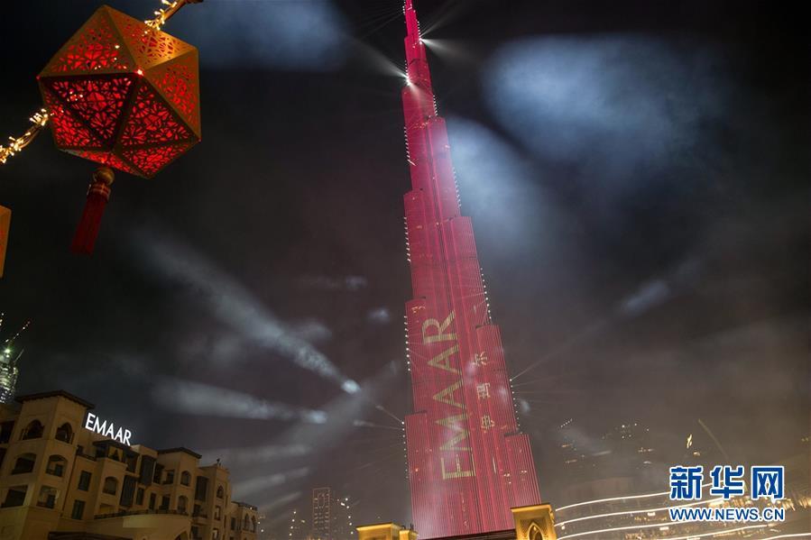 2月4日,在阿联酋迪拜,世界第一高楼哈利法塔上演春节灯光秀,迎接中国新年。 新华社发(马哈茂德 哈立德摄)
