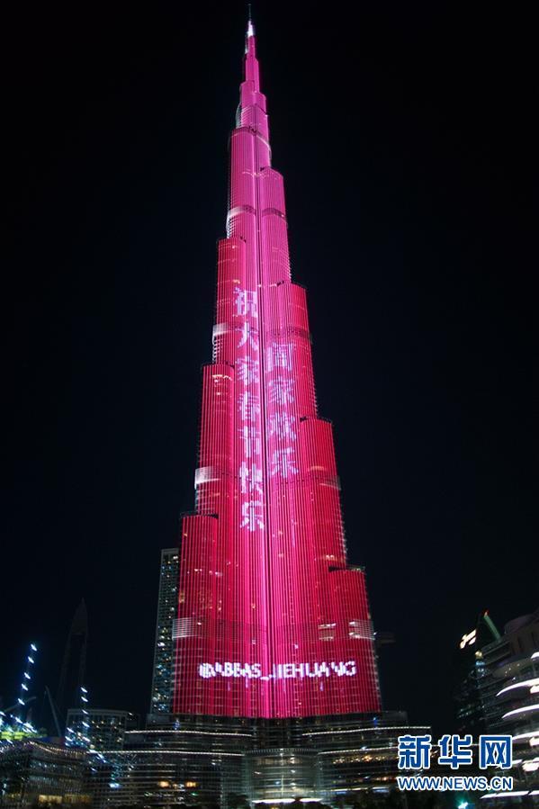 2月4日,在阿联酋迪拜,世界第一高楼哈利法塔上演春节灯光秀,迎接中国新年。新华社发(马哈茂德 哈立德摄)