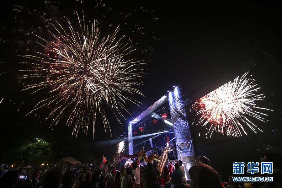 2月3日,在阿根廷布宜诺斯艾利斯,观众在“欢乐春节 魅力阿根廷”猪年春节庙会上观看焰火表演。 新华社发(马丁 萨巴拉摄)