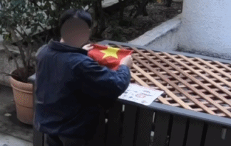 这位大爷再次出现在视频中,他又拿着国旗返回了院子,同时还带了一张看起来像是报纸或是广告宣传单的东西。