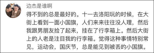 一些网友也分享了自己曾经“顺走”国旗的小故事。这些国旗可能插在行李箱上,挂在窗口,也可能就在桌案抬头之处……