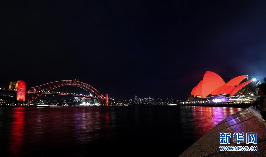 2月4日晚,澳大利亚悉尼的悉尼歌剧院和海港大桥同时点亮象征吉祥的红色照明。 新华社记者 白雪飞 摄